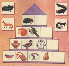 2. Предметные картинки тех же размеров, что квадраты у пирамиды, содержащие в названиях от двух до пяти звуков: еж, уж, ус (2); мак, рак, жук, сыр, ухо, ком, сом (3); рыба, ваза, роза, лиса, утка, жаба (4); сумка, шапка, ветка, чашка, туфли, кофта, миска, кошка, мышка (5). Ход игры на занятии: Воспитатель демонстрирует пирамиду, поясняет: «Эту пирамиду мы будем строить из картинок. В самом верху у нас должны быть картинки с короткими названиями, состоящими всего из двух звуков, ниже - из трех, еще ниже - из четырех звуков. А в основании пирамиды должны быть помещены картинки с названиями из пяти звуков». Воспитатель вызывает поочередно детей для выполнения игрового задания. Сначала дети берут любые картинки, отчетливо произносят слово и определяют в нем количество звуков. Например: «В слове жук три звука. Я поставлю эту картинку во второй ряд (от верха)». Или: «В слове чашка пять звуков, я поставлю картинку в нижний ряд». Ошибочный ответ не засчитывается, и картинка возвращается на прежнее место. В процессе игры дети ищут картинки только для незаполненных квадратов. В конце упражнения воспитатель спрашивает о том, как устроена эта необычная пирамида. Ход игры вне занятия Играют семеро детей. Воспитатель кладет карту с пирамидой на середину стола и раздает каждому играющему по 2 картинки. Дети определяют количество звуков, содержащихся в названиях предметов, и кладут картинки на соответствующие квадраты. Date: 2015-07-27; view: 485; Нарушение авторских прав |