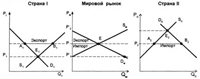 Если исходить из предпосылки баланса спроса и предложения, то графически понятия экспорта и импорта можно представить так, как показано на рисунке 1.5. Представим, что страны I и II в изоляции друг от друга производят и потребляют один и тот же товар. Спрос и предложение товара в стране I составляют Dj и Sr а в стране II — соответственно Dn и Sn. По горизонтальной оси показаны объемы производства товара Qr Qn, по вертикальной — его внутренняя цена Рр Рп соответственно в странах I и II. Рыночное равновесие спроса и предложения на товар достигается в точке Ех в стране I, где цена товара составляет Рр и точке Е2 в стране II, где цена товара составляет Р2. Поскольку Рг < P2, данный товар дешевле в стране I, чем в стране II, и, следовательно, стране I выгодно его экспортировать в страну II и получить от этого какую-то прибыль, а стране II выгодно его импортировать из страны I и тем самым сэкономить и снизить его закупки на внутреннем рынке. Из-за различия во внутренних ценах между странами I и II у страны I при любой цене на товар больше, чем Рр возникает его избыточное предложение. У страны II при любой цене на товар меньше, чем Р2, возникает избыточный спрос на него. Страны устанавливают торговые отношения. Равновесная цена Р1 в стране I показывает, что в точке Е1 спрос на товар точно равен предложению и у страны I нет товара для экспорта. Тем самым определяется точка Р1 на кривой предложения на мировом рынке, показывающая минимальную цену, по достижении которой экспорта товара из страны I не будет. Для страны II равновесная цена Р2 показывает, что в точке равенства спроса и предложения Е2 стране не требуется никакого импорта товара, поскольку она обходится своими собственными ресурсами. Тем самым определяется точка Р2 на кривой спроса на мировом рынке, показывающая максимальную цену, по достижении которой импорт товара страной II прекратится.