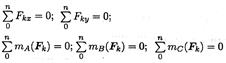 где А и В — разные точки приведения. Условие равновесия произвольной плоской системы сил может быть сформулировано следующим образом: Для того чтобы твердое тело под действием произвольной плоской системы сил находилось в равновесии, необходимо и достаточно, чтобы алгебраическая сумма проекций всех сил системы на любую ось относительно любой точки в плоскости действия сил равнялась нулю.
