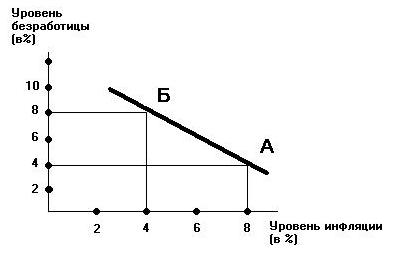 Инфляция - феномен, присущий исключительно бумажно-денежному обращению. По сути своей она представляет собой процесс обесценивания бумажных денег из-за переполнения ими каналов денежного обращения. Безработица — социально-экономическая ситуация, при которой часть активного, трудоспособного населения не может найти работу, которую эти люди способны выполнить. Безработица обусловлена превышением количества людей, желающих найти работу, над количеством имеющихся рабочих мест, соответствующих профилю и квалификации претендентов на эти места. Безработица и инфляция находятся в определенной количественной зависимости. Профессор Лондонской экономической школы Филипс в конце 50-х годов установил такую закономерность: чем ниже уровень инфляции, тем выше уровень безработицы, и наоборот. И это объяснимо. С повышением уровня безработицы уменьшается покупательная способность населения. Безработица отрицательно сказывается на уровне оплаты труда. В итоге уровень инфляции снижается. Этот процесс наглядно представлен в виде кривой Филипса [9,14].