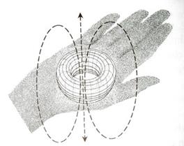 Тороидальная (пончик) форма – принципиаль-ная характеристика магнитного поля. Магнитная ось север-юг центрирована в сере-дине отверстия посередине тора. Такая форма является одним из аспектов движения спиралевидно-вращающегося вихря, захваты-вающего и испускающего свет и энергии. Тор – гиперпространственный межпространствен-ный соединитель виртуальных реальностей. Он – межпространственный вихрь. Если стержневой магнит поместить в закрытый контейнер, то магнитные силовые линии будут захватываться. Это сильно сдавливает магнитное поле, каким мы его знаем. Однако, спиновое поле магнита не может и не экранируется контейнером. Ибо торсионное поле магнита существует в физическом вакууме, отличающемся от нашего трехмерного пространства. Мы ссылаемся на вектор потенциала, существующего в отсутствие наблюдаемого магнитного поля (см. рисунок 2.11). Знаменитый эксперимент, известный как эффект Бома-Агаронова, установил, что вектор потенциала обладает далеко идущим эффектом, даже если магнитные поля не существуют в нормальном прос РУКА КАК ЖИВАЯ АНТЕННА Возвращаясь к магнетизму руки, мы обнаруживаем несколько интересных аналогий со стержневым магнитом. Но также существуют несколько необычных различий. Как углеродно-электрически-световые существа, мы наделены способностью изменять или модулировать частоту, в отличие от материи на кремниевой основе. Эмоция и намерение регулируют вибрации в энергетическом поле человека. Голографическая природа человеческого тела и и энергетическое поле человека помещают все эти вибрации на ладонь вашей руки! Это положение хорошо отражено в труде Валери Хант, Институт Сердце/Математика, Дэвисом и Роулсом и многими другими. Влияние эмоций также может быть видно на кирлиановских фотографиях, наряду с другими методами фотографирования ауры. Рука соединяется с сердцем, Намерением и скалярным действием мозга. Человеческое тело – живая антенна, и как таковое, является приемником и излучателем невероятной полосы частот. Ладони несут противоположные магнитные полярности. Тыльная сторона каждой руки также несет противоположные магнитные полюса. Спин / торсионное поле конически простирается в обоих направлениях из центра ладони (см. рисунок 7.5). Тор центрирован вокруг магнитного экватора и одинаково распространяется на обеих сторонах руки. Очень похоже, что спиралевидное вихревое поле руки связано с формой спиралевидной энергии в ДНК. Спиралевидный вихрь на много порядков увеличивает величину, ибо энергия коллективно расширяется вовне из шаблона ДНК. ТОРСИОННОЕ ПОЛЕ – СПИН/СПИН ВЗАИМОДЕЙСТВИЕ: ОКОНЧАТЕЛЬНЫЙ ОТВЕТ... Нет окончательных ответов, но мы можем продолжать высказывать предположения о вероятностях. Каковы другие воздействия, являющиеся результатом полей рук? Давайте рассмотрим влияние спин/спин взаимодействий торсионных полей рук на биологическую и тонкую материи. Торсионные поля взаимодействуют с другими торсионными полями. Это научный факт. Также, имеются примеры, где они могут оказывать непосредственные интерактивные действия между энергетической подструктурой торсионного поля и электромагнитным полем. Это объясняется Александром Шпильманом, построившим уникальный генератор торсионного поля. Также, он обсуждал физические свойства торсионных полей. Шпильман использ