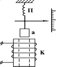 постоянная, расположена легкая рамка 4, состоящая из нескольких витков ровода, концы которого присоединены к спиральным пружинам 5 и 6. Через эти пружины в рамку подается измеряемый ток. При прохождении тока через рамку на нее действует вращательный момент, рамка поворачивается вокруг оси 7, пружины 5 и 6 закручиваются, и создается противодействующий момент. При равновесии моментов рамка устанавливается неподвижно, а соединенная с рамкой стрелка 8 указывает угол поворота. Значение этого угла пропорционально силе измеряемого тока, поэтому шкала прибора равномерная. По указанному принципу изготовляется большинство лабораторных и технических приборов постоянного тока. Их можно использовать, например, в качестве амперметров, включая параллельно рамке шунт, или в качестве вольтметров, включая последовательно с рамкой большое добавочное сопротивление. Принцип действия приборов электромагнитной системы основан на взаимодействии ферромагнитного сердечника с магнитным полем катушки с током. Амперметр такой системы схематически показан на рис.1.2, где К - катушка, по которой течет измеряемый ток; a - железный стержень, подвешен-ный на пружине П. Катушка с током I создает неоднородное магнитное поле с индукцией В, при этом на стержень a действует сила F ~ М(¶В/¶z), где М – намагниченность стержня, z - ось катушки и стержня. Эта сила втягивает
