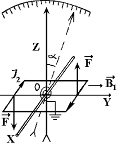 В приборах электродинамической системы используется взаимодействие двух катушек с токами. Одна из них неподвижна. Магнитное поле B1 , создаваемое этой катушкой, пропорционально силе тока I1. Вторая, подвижная катушка, состоит из большого числа витков тонкой проволоки. На оси этой катушки закреплены стрелка прибора и легкие спиральные пружины, противодействующие повороту катушки.