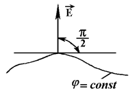 - в сторону максимального убывания потенциала φ(x,y,z). Для графического изображения полей пользуются силовыми линиями. Силовая линия проводится так, что касательная к ней в каждой точке совпадает с прямой, вдоль которой направлен вектор напряженности Е в этой точке. Этим линиям приписывают направление, совпадающее с направлением вектора напряженности Е. Плотность силовых линий, то есть число силовых линий, пронизывающих площадку в 1 м2, расположенную перпендикулярно к ним, выбирают равной величине Е. Таким образом, с помощью силовых линий можно графически изобразить и величину, и направление вектора напряженности Е. Эквипотенциальной называют поверхность, все точки которой имеют одинаковый потенциал φ(x,y,z) = const. Очевидно, в каждой точке такой поверхности вектор Е перпендикулярен к этой поверхности (рис.2.4), следовательно, силовые линии ортогональны к эквипотенциальным поверхностям. Эквипотенциальные поверхности обычно строят так, чтобы разности потенциалов между любыми двумя соседними поверхностями были одинаковыми (рис.2.5). Тогда густота эквипотенциальных поверхностей наглядно характеризует напряженность поля в разных точках. Там, где эти поверхности расположены гуще, напряженность поля больше.