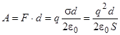 Формула (3.4) емкости плоского конденсатора справедлива только при малых значениях расстояния d между пластинами, когда можно пренебречь нарушениями однородности электростатического поля у краев пластин. Энергию конденсатора определим следующим образом. Для простоты рассмотрим плоский конденсатор, считая ε =1. На каждую пластину действует сила F = q∙Е = q (σ / 2εо), где q - заряд одной пластины, Е - поле, созданное другой пластиной. При изменении расстояния от 0 до d над конденсатором совершается работа Таким образом, заряженный конденсатор обладает энергией: