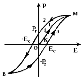 направлению электрического поля. Процессы поляризации становятся необратимыми. При некотором значении Р, соответствующем точке L, кристалл становится однодоменным и достигается насыщение. На участке LМ поляризация снова линейно зависит от поля, увеличение поляризации происходит за счет электронных и ионных смещений. Если уменьшить напряженность поля, то поляризация кристалла будет уменьшаться не по начальной кривой 1, а по кривой 2, лежащей выше начальной. При Е = О сегнетоэлектрик сохраняет остаточную поляризацию Рr, т.е. сегнетоэлектрик остается поляризованным в отсутствии внешнего электрического поля. Чтобы уничтожить остаточную поляризацию, надо приложить электрическое поле обратного направления (- Ес). Величина Ес называется коэрцитивной силой. Если далее изменять напряженность поля Е, то поляризация Р изменяется по кривой 3 петли гистерезиса (см.рис.4.4). Сегнетоэлектрические свойства сильно зависят от температуры. Существует определенная для каждого сегнетоэлектрика температура, называемая точкой Кюри, при которой вещество теряет свои особые электрические свойства и кристалл становится обычным полярным диэлектриком.