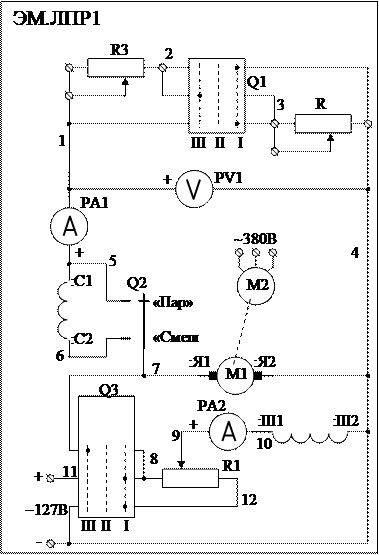 Материальное обеспечение - универсальный лабораторный стенд, расположенный в аудитории 208; источник питания переменного трёхфазного тока 380В; источник питания постоянного тока 127В; мотор-генераторная установка; амперметр постоянного тока (2 шт.); вольтметр постоянного тока, реостат 3 шт.