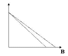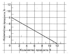 Рис.4.11 Если у потребителя имеется 48 рублей, при этом товар А стоит 6 рублей, а товар В 4 рубля, то бюджетное ограничение будет выглядеть как на рис. 4.11. 48: 6 = 8 товара А, то товар В = 0; иначе 48: 4 = 12 товара В, товар А = 0. Соединив данные точки по прямой получаем линию бюджетного ограничения. Наклон бюджетного ограничения показывает отношение цен соответствующих товаров, см.рис. 4.12.