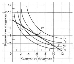 Теперь необходимо сопоставить наши желания с нашими возможностями, поэтому совмещаем линию бюджетного ограничения с картой кривых безразличия, как на рис. 4.15. W – точка, которая желательна, т.к. кривая на которой она лежит, самая высокая из карты кривых безразличия, но такое сочетание товаров недоступно, ввиду того, что линия бюджетного ограничения лежит ниже.