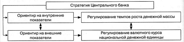 Денежно-кредитная политика может иметь тотальный либо селективный характер. Тотальный характер — мероприятия Банка России распространяются на все учреждения банковской системы. Селективный характер — мероприятия Банка России распространяются на отдельные кредитные учреждения или на отдельные виды банковской деятельности. Инструментами селективной политики являются: 1) установление лимитов учетных и переучетных операций (по отраслям, регионам); 2) лимитирование отдельных видов операций банков; 3) установление маржи при проведении различных финансово-кредитных операций; 4) регламентация условий выдачи отдельных видов ссуд различным категориям заемщиков; 5) установление кредитных потолков и т. д. Выбор типа денежно-кредитной политики, а соответственно и набора инструментов регулирования Банк России осуществляет исходя из состояния хозяйственной конъюнктуры. Выбранные и разработанные направления денежно-кредитной политики утверждаются законодательным органом. Одним из основных принципов определения стратегии центральных банков служит ориентация на регулирование денежной массы в национальной экономике или регулирование валютного курса национальной денежной единицы по отношению к какой-либо стабильной иностранной валюте, т. е. на внутренние или внешние показатели (рис. 9.3).