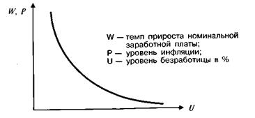 Зависимость между нормой безработицы, приростом номинальной заработной платы и инфляцией обнаружил в конце 50-х годов ХХ в. английский экономист А. Филлипс. Анализируя данные более чем за сто лет, он пришел к выводу, что существует некий уровень безработицы (6-7%), при котором уровень заработной платы постоянен и ее прирост равен нулю. Когда безработица снижается ниже этого естественного уровня, наблюдается более быстрый прирост зарплаты, и наоборот. В дальнейшем, используя тезис о сильной корреляционной взаимосвязи между ростом зарплаты и ценами, данная закономерность была преобразована во взаимосвязь безработицы и темпов роста цен (инфляции). Внешний вид кривой Филлипса представлен на рис 10.5.
