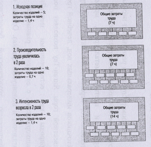 Рис. 13.2 Влияние роста производительности и интенсивности труда на затраты труда на единицу продукции и общие затраты его