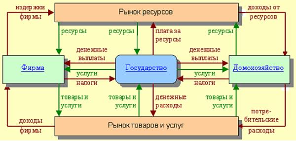 Рис.15.1 – Модель экономического кругооборота Фирмы предъявляют спрос на ресурсы и несут расходы в форме издержек. Предложение фирмой товаров и услуг принимает денежную форму дохода при условии продажи. Государство предоставляет в пользование общественные товары (товары, пользование которыми возможно всеми, независимо от того, платят за них или нет), а также денежные выплаты (пенсии, пособия, дотации и т.д.) Необходимые ресурсы, товары и услуги государство закупает у домохозяйств и фирм на рынках ресурсов, товаров и услуг. Домохозяйства предъявляют спрос на товары и услуги, осуществляя расходы. Источником осуществляемых расходов являются доходы (заработная плата, проценты, прибыль, рента), полученные от продажи ресурсов (труда, капитала, предпринимательской способности, земли). Модель кругооборота показывает: 1. Спрос и предложение взаимодействуют – спрос формирует предложение, а предложение развивает спрос. 2. Реальный поток экономических благ дополняется встречным денежным потоком доходов и расходов 3.Координация действий основных экономических субъектов осуществляется с помощью рынков через механизм равновесных цен. 4. Между этими рынками существует тесное взаимодействие: изменение на одном приводит к изменениям на другом. 5. Домохозяйство и фирмы реализуют свои интересы, государство создает необходимые для этого условия, каждый из субъектов зависим друг от друга. Наряду с рассмотренными рынками товаров и услуг и ресурсов существуют и другие виды рынков, которые также связаны друг с другом. Всю совокупность многочисленных рынков можно классифицировать по ряду признаков: 1) В зависимости от соотношения спроса и предложения: · Рынок продавца – вид рынка, где спрос на товар больше, чем его предложение. Черты рынка продавца: - наличие дефицита; - недостаточное качество товара; - высокие цены. · Рынок покупателя – тип рынка, где предложение превышает спрос. Основные черты: - отсутствие дефицита; - улучшение качества продукции; - тенденция к снижению цен. 2) По экономическому назначению объектов рынка: • рынок товаров и услуг – рынок, на котором домашние хозяйства осуществляют покупку товаров и услуг для личного потребления; • рынок ресурсов – купля-продажа первичных (труд, земля, капитал, предпринимательская способность) и промежуточных (полуфабрикаты) ресурсов; • финансовый рынок – купля-продажа финансовых средств (денег, валюты, ценных бумаг, ссудных капиталов); • информационный рынок – купля-продажа информационного продукта (деловой, коммерческой, научной и другой информации). В России он находится в процессе формирования • рынок интеллектуального продукта – купля-продажа услуг культуры, здравоохранения, образования, инноваций, а так же любого информационного продукта, возникающего в результате духовной деятельности 3) По географическому принципу: § местный рынок – сфера обмена охватывает территорию области, края, города; § региональный рынок – территориальный рынок с ярко выраженными региональными особенностями; § национальный рынок – совокупность рынков, действующих в пределах какой-либо страны; § мировой рынок – отношения купли-продажи между представителями различных стран, характеризующиеся крупномасштабностью и регулярностью сделок, ведением расчетов в свободно-конвертируемой валюте. 4) По степени огр