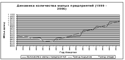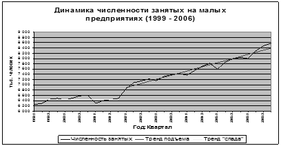Рис. 16. 1 Динамика количества малых предприятий в России Визуальный анализ графика позволяет констатировать рост количества малых предприятий, начиная с 2002 года, до этого момента (с 1999 по 2001 гг.) наблюдалось медленное сокращение их количества, что позволяет разделить исследуемый промежуток времени на два соответствующих периода: 1) Период спада (1999 – 2001 гг.), 2) Период подъема (2002 – 2006 гг.). Кроме этого, очевидным является факт сезонности: данные свидетельствуют о том, что в 1-ом квартале каждого нового года количество малых предприятий меняется существенно по сравнению с изменениями в течение года. Другими словами, основная волна регистрации/ликвидации малых предприятий приходится на начало года, а уже впоследствии происходят обычные рыночные подстройки, определяющие годовую динамику. При этом в 2003 году количество малых предприятий почти не изменилось по сравнению с 2002 годом, что немного нарушает общую тенденцию скачкообразного роста малых предприятий в период подъема. В период спада (1999–2001 гг.) количество малых предприятий снижалось в среднем на 22 тысячи предприятий в год. В период подъема (2002–2006 гг.) количество малых предприятий росло в среднем на 38,5 тысяч предприятий в год. Минимум малых предприятий, который пришелся на первую половину 2001 года, составил 841,2 тысяч предприятий. На рис. 2 представлен график численности занятых на малых предприятиях за 1999–2006 гг. Визуальный анализ позволяет выявить в динамике численности занятых на малых предприятиях закономерности, аналогичные динамике количества малых предприятий.