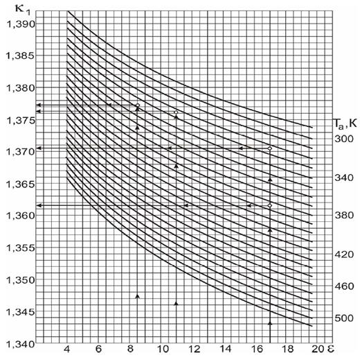 Процес стиску характеризується показником політропи стиску, температурою, тиском, теплоємністю робочого тіла у процесі стиску. Величина показника політропи стиску n1 визначається на основі дослідних даних залежно від ступеня стиску і температури в кінці стиску Та; для карбюраторних двигунів: n1=(к1– 0,01 )…(к1 – 0,04 ), де к1 – показник адіабати стиску, який залежить від ε і Та. Визначаємо з номограми (рисунок 1). Для ε = 8 і Та =342,4 К к1 =1,377. Приймаємо для розрахунків n1 =1,377 – 0,037 = 1,325. Тиск в кінці процесу стиску визначаємо за формулою: р с = ра· Температуру робочого тіла в кінці процесу стиску визначаємо за формулою: Т с =Та· Розрахункові значення величин рс і Тс для сучасних бензинових двигунів внутрішнього згоряння знаходяться у межах рс = 0,9…2,0 МПа, Тс =600…800 К. Для визначення середніх мольних теплоємностей у залежності від температури використовуємо формули. Таким чином, середня мольна теплоємність в кінці процесу стиску при сталому об’ємі для окремих компонентів становить: –повітря де tc =(Tc- 273 )° C = (673.03 – 273)=400,03°C;