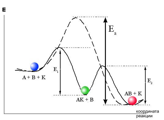 В упрощенном виде механизм действия катализатора можно представить следующим образом. Изменение энергии активации реакции происходит за счет образования катализатором К с одним из реагентов А промежуточного соединения АК: A + K = AK (1) Суммарная реакция A + B = AB BНо вместо энергетического барьера этой реакции преодолеваются более низкие барьеры реакций (1) и (2): E1 и E2.