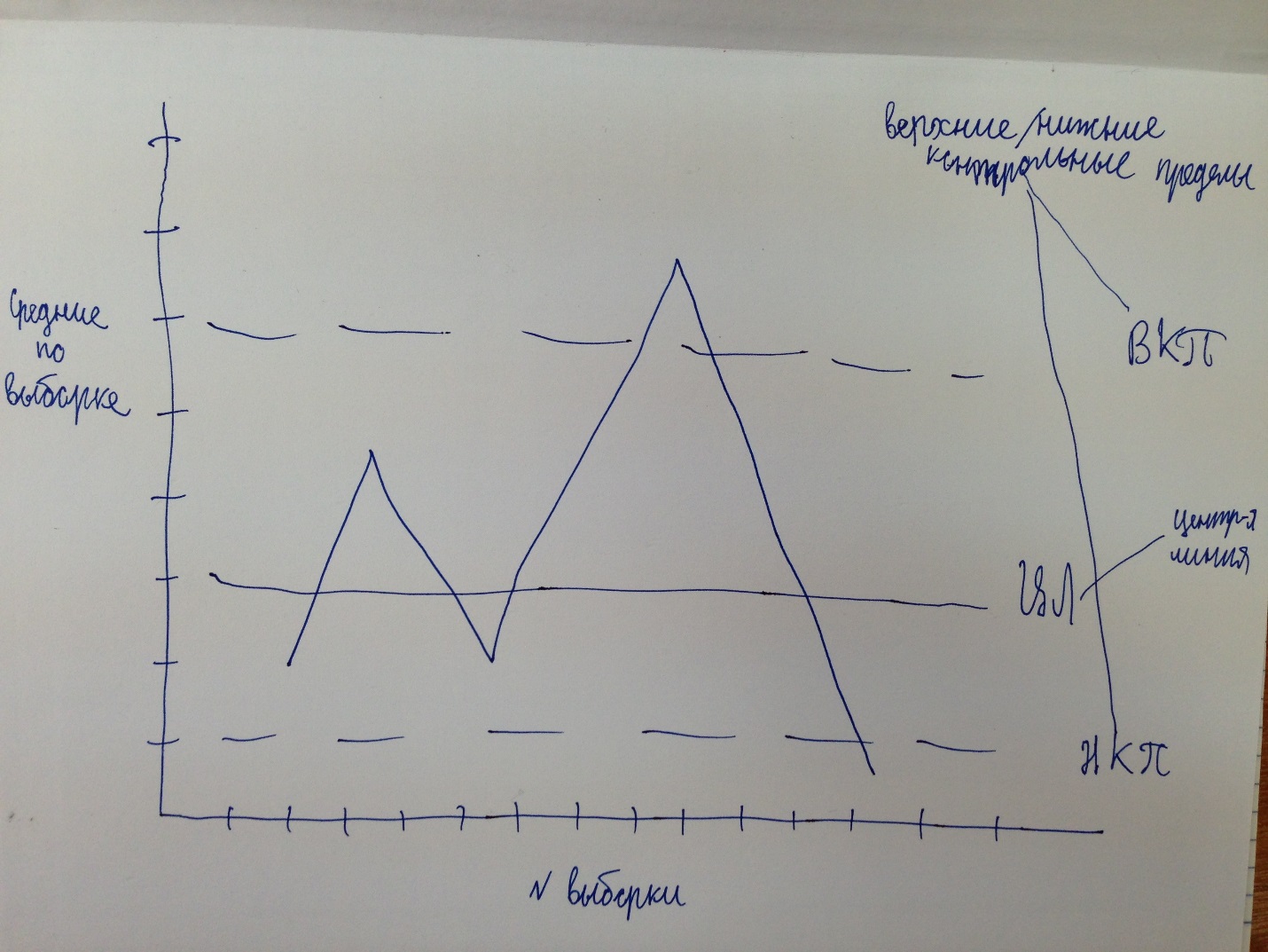 Назначение метода. Применяется везде где требуется отслеживать состояние процесса во времени и воздействовать на процесс до того как он выйдет из-под контроля Цель метода. Осуществлять оценку управляемости действующего процесса. В Случае управляемости процесса можно осуществить оценку его воспроизводимости. В Случае статистически неуправляемого процесса осуществлять проведение корректирующего воздействия и проверку эффективности принятых мер. (Дома посмотреть в точке зрения применимости: поверка и проверка) В период запуска процесса можно осуществлять оценку возможности процесса, то есть способности удовлетворять технические требования. Суть метода. Контрольная карта – это инструмент, позволяющий отслеживать ход процесса и воздействовать на него, предупреждая его отклонения от предъявляемых к процессу требований. План действий. 1) Выбор показателя, плана выборки, типа карты. 2) Сбор данных. 3) Вычисление выборочных статистик, центральной линии, контрольных пределов. 4) Построение контрольной карты. 5) Оценка управляемости процесса. 6) Совершенствование системы. 7) Пересчёт контрольной карты (если это необходимо)