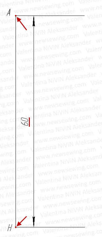 Длина брюк. От точки А вниз откладываем мерку длины брюк Дбр и ставим точку Н. В нашем примере это 60 см, а вы откладываете свою мерку.