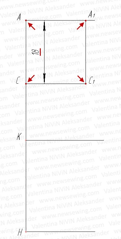 Линия шага. От точки А вниз откладываем 1/2 мерки полуобхвата бедер плюс 2 см и ставим точку С. АС=Сб:2+2см=32:2+2=18 см. Из точки С вправо откладываем расстояние, равное отрезку AA1, и ставим точку C1. Точки A1 и С1 соединяем.