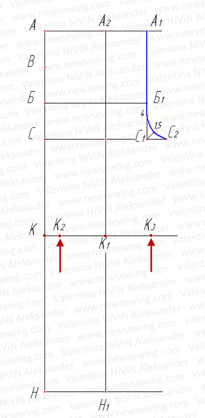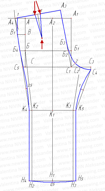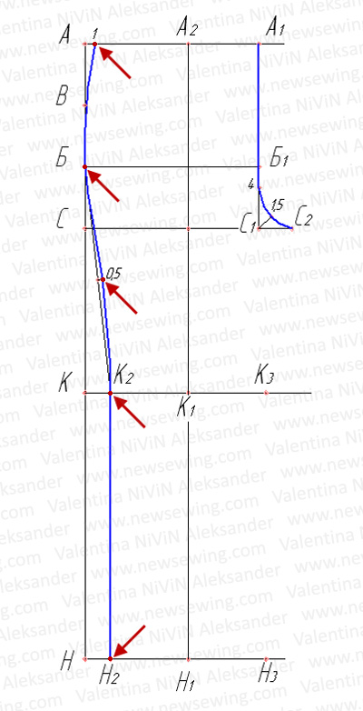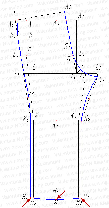 Линия бокового шва. Точку А4 соединяем с точкой К4. Из точек В; Б; и С проводим влево горизонтальные линии до пересечения с прямой А4К4 и обозначаем соответственно буквами В1; Б4 и С5. Расстояние С5К4 делим пополам и от точки деления вправо откладываем 0,5 см. От точки А4 вправо откладываем 1 см, обозначаем цифрой 1. Соединяем точки 1; В1; Б4; 0,5; К4; Н4. Участок от точки 1 до К4 оформляем плавной кривой, а участок от точки К4 до Н4 прямой линией.