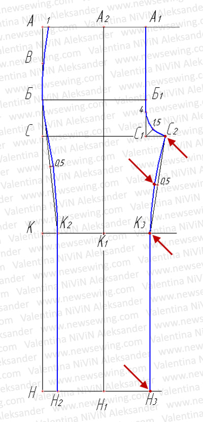 Линия бокового среза. Точку Б соединяем с точкой К2, делим этот отрезок пополам. В точке деления вправо откладываем 0,5 см. От точки А вправо откладываем 1 см, обозначаем эту точку цифрой 1 и соединяем ее с точками В; Б; 0,5; К2; Н2. Расстояние от точки 1 до К2 оформляется плавной кривой, а от К2 до Н2 прямой линией, тем самым оформляя линию бокового среза брюк.