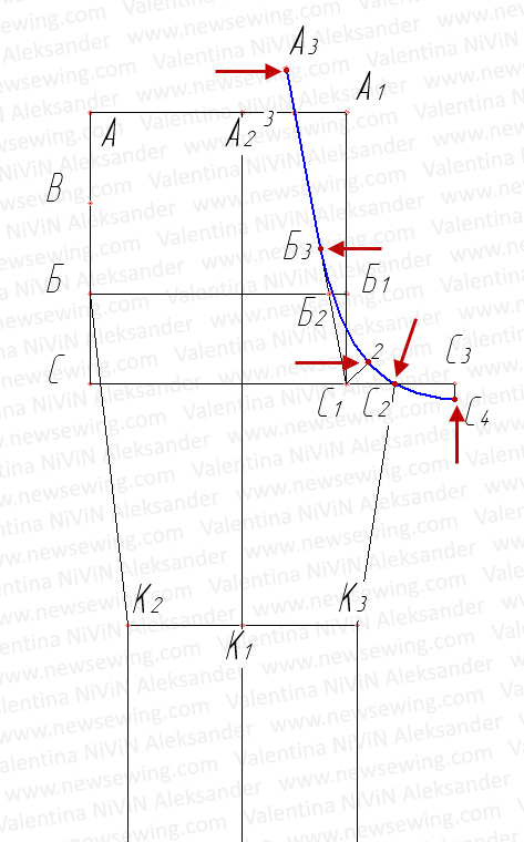 Линия сидения. Расстояние А2А1 делим пополам, точку деления обозначаем цифрой 3. От точки С1 вверх через точку 3 проводим прямую, продолжая ее вверх за линию талии на 3 см и ставим точку А3. Точку пересечения с линией ББ1 обозначаем буквой Б2. От Б2 вверх по этой линии откладываем 2,5–3 см и ставим букву Б3.