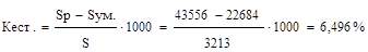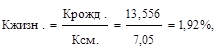 5. Общий прирост численности населения края за год (ΔS) равен: ΔS = Sн – Sн = 3213 – 3200 = 13 тыс. чел., отсюда коэффициент общего прироста: Коб. = Кест. + Кмех. = 2,7 +1,6 = 4,3%. 6. Коэффициент, характеризующий соотношение между рождаемостью и смертностью называется коэффициентом жизненности В.И. Покровского (Кжизн.):