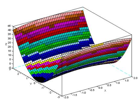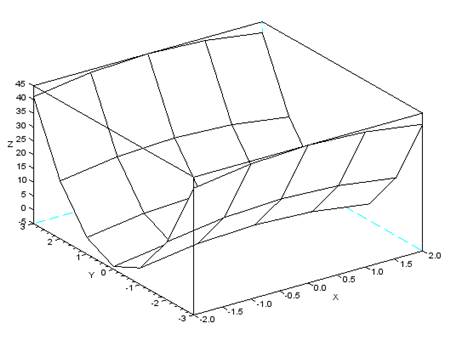 Обращение к функции meshgrid имеет вид: [X, Y [Z]] = meshgrid(x, y [z]) здесь (x, y [z]) -массивы 2 (3) исходных параметров X, Y (Z), указываемые через запятую; [X, Y [Z]] -матрицы в случае 2 и массивы в случае 3 входных величин. После формирования сетки вывести в нее график можно с помощью функции surf либо mesh. Так же, как и в случае с функциями plot3d и plot3d1, surf строит поверхность, заливая каждую ячейку цветом, который зависит от конкретного значения функции в узле сетки, а mesh заливает ее одним цветом. Таким образом, mesh является полным аналогом функции surf со значением параметров Сolor mode=индекс белого цвета в текущей палитре цветов и Сolor flag=0. Обращение к функциям имеет вид: surf([X,Y],Z,[color,keyn=valuen]) mesh([X,Y],Z,[color,]) здесь X,Y - массивы, задающие прямоугольную сетку; Z - матрица значений функции; color - матрица действительных чисел, устанавливающих цвет для каждого узла сети; keyn=valuen - последовательность значений свойств графика key1=value1, key2=value2,..., keyn=valuen, определяющих его внешний вид. В случае, если прямоугольная сетка была построена командой meshgrid, необходимости указывать параметры X,Y нет. В самом простейшем случае к функции surf можно обратиться так surf(z). Пример 5. Построить график функции C помощью команды meshgrid создадим прямоугольную сетку. Здесь −2:2 определяет положение прямых, параллельных оси После формирования сетки вычислим значение z во всех узлах z=5*y.^2-x.^2 z = 41. 44. 45. 44. 41. 16. 19. 20. 19. 16. 1. 4. 5. 4. 1. - 4. - 1. 0. - 1. - 4. 1. 4. 5. 4. 1. 16. 19. 20. 19. 16. 41. 44. 45. 44. 41.Обратимся к функции mesh для построения графика Программа будет иметь вид: [x y]=meshgrid(-2:2,-3:3);z=5*y.^2-x.^2;mesh(x,y,z); Как видно из рисунка, сетка, построенная с шагом 1, слишком редкая, а вычисленных значений функции в узлах недостаточно для изображения плавного графика. Поэтому зачастую лучше самостоятельно указывать шаг формирования прямоугольной сетки при вызове команды meshgrid. Пример 6. Построить график функции Создадим с помощью команды meshgrid прямоугольную сетку, указывая шаг, через который будут построены параллельные координатным осям линии 0,1 для обеих осей. В этом случае сетка будет плотнее, а график более плавным, чем в предыдущем примере. Далее вычисляем значения функции Z и вызываем surf для построения поверхности. [x y]=meshgrid(-2:0.1:2,-3:0.1:3);z=5*y.^2-x.^2;surf(x,y,z) Пример 7. Построить график системы функций: