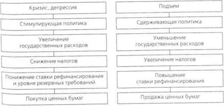 Среди экономистов нет разногласий относительно необходимости проведения государством для поддержания экономической стабильности антициклической политики, сглаживающей циклические колебания. Антициклическая политика – использование инструментов государственного регулирования для противодействия колебаниям экономической конъюнктуры, сглаживания верхней и нижней точек экономического цикла. Антициклическая политика используется для регулирования стабилизации экономики в двух основных направлениях: преодоление спада и сдерживание подъема. Так, в период кризиса проводится стимулирующая политика, а в период подъема, «перегрева» экономики – сдерживающая (табл. 14.2). Как мы увидим в дальнейшем, антициклическая политика государства является составной частью его финансовой и денежно–кредитной политики. Таблица 14.2 Антициклическая политика государства