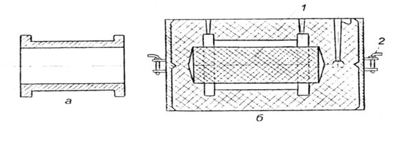 Виготовляють разові форми з двох (іноді більше) частин. Спочатку виробляють нижню нівформу, потім верхню, а далі їх складають. Перед складанням внутрішні поверхні півформ очищають від випадкових частинок формової суміші стисненим повітрям (обдувають) і, якщо у відливку має бути отвір, вставляють стрижень 1 (рис. 1). Далі верхню півформу накладають на нижню. Положення опок у процесі складання форми фіксується штирями 2. Форма готова до заливання. Рис. 1. Відливок (а) і форма для його виготовлення (б)