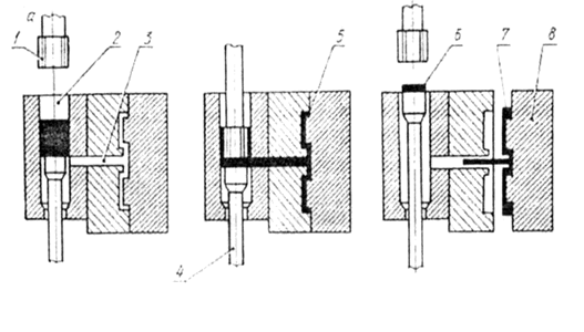 Лиття під тиском. При цьому способі лиття розплав заповнює металеву форму під тиском поршня або стисненого повітря (рис. 4). Рис. 4. Схема лиття під тиском