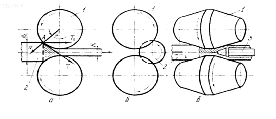 При поздовжньому прокатуванні (рис. 6 а) валки обертаються в різні боки, деформуючи заготовку, яка рухається перпендикулярно до осей валків. Обов'язковою умовою прокатування є контактне тертя між валками та деформованим металом. Умова захвату - коефіцієнт тертя між валками і заготовкою має бути більший від тангенса кута захвату (а) При поперечному прокатуванні (рис. 6 б) валки обертаються в один бік і осі їх паралельні, а заготовка деформується ними при обертанні навколо своєї осі. При поперечно-гвинтовому прокатуванні (рис. 6 в) прокатні валки обертаються в один бік, осі їх розташовані під певним кутом, а заготовка обертається і водночас переміщується вздовж своєї осі. Інструментом прокатування є валки. Вони можуть мати гладку поверхню, ступінчасту, рівчакову (калібровану) (рис.7). Валки одержують литтям із відбіленого чавуну або з вуглецевої і легованої сталі. Обладнанням для процесу прокатування є прокатні стани. Прокатний стан має привід, передавальний механізм і робочу машину. Робоча машина має одну або декілька робочих клітей. Прокатні стани класифікують за призначенням, кількістю клітей, кількістю валків у них, схемою розміщення клітей.