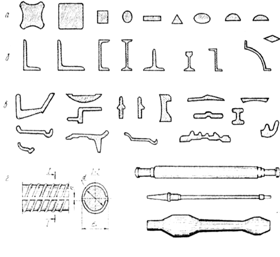 Сукупність профілів різного поперечного перерізу і розмірів, що одержують при прокатуванні, називають сортаментом. Розрізняють сортовий (простий і фасонний) (рис. 8 а, б), листовий, трубний і спеціальний (рис. 8 в)