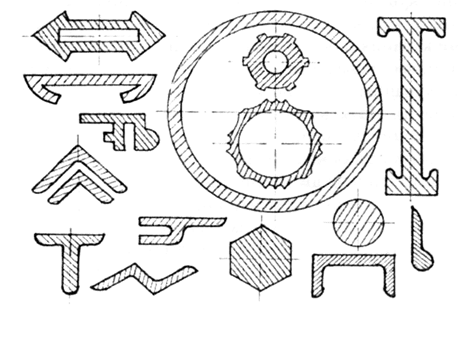Заготовками для пресування є прокатні заготовки, нарізані зі сталі, кольорових металів і сплавів. Усі метали і сплави, крім свинцевих, пресують гарячими. За схемами пресування буває пряме і зворотне. При прямому (рис. 12а) заготовка 3 і пуансон 1 рухаються в один бік. Частина заготовки залишається в контейнері 2 (це прес-залишок). Маса його становить 8-12% від маси заготовки. При зворотному пресуванні (рис. 12 б) матриця 4 встановлюється на кінці пустотного пуансона 1. Матриця переміщується разом з пуансоном а метал заготовки витискається їй назустріч, тобто в напрямі, зворотному до руху пуансона. При зворотному пресуванні буває менше відходів (залишок становить 6-10%), воно потребує менших зусиль. Матриці, пуансони, прес-шайби виготовляють із високолегованих сталей і сплавів, що містять вольфрам, ванадій, хром, молібден та ін. Обладнанням для пресування є горизонтальні та вертикальні гідравлічні преси. Частіше використовують горизонтальні. Сортамент пресування близький до прокатного. Пресуванням можна одержати труби із зовнішнім діаметром 200- 400 мм і товщиною стінки 1,5-12 мм, прути, дріт, кутники, швелери, багато інших складних спеціальних профілів (рис. 13). Ряд профілів неможливо дістати іншим способом.