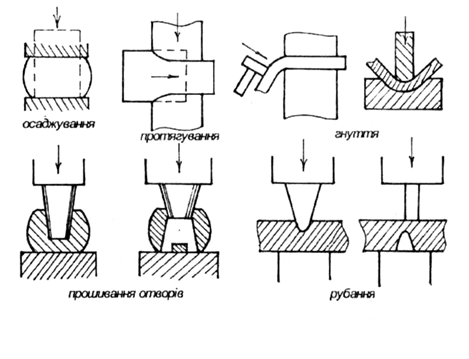 Техніко-економічні показники. Найважливішим показником пресування є дуже висока якість пресованих виробів. Ці вироби значно якісніші аналогічних прокатних. Матрицю можна змінювати, а отже, виготовляти невеликі партії заготовок, не знижуючи ефективності виробництва. Є змога виготовляти невеликі заготовки і складних профілів. Процес високопродуктивний. Важливим недоліком пресування є значні втрати металу (прес-залишок). Крім того, вироби, одержані пресуванням, мають високу собівартість. Вільне кування. Вільним куванням називається обробка пластичних металевих матеріалів статичним або динамічним тиском. Це один із найдавніших способів обробки тиском. При куванні формоутворення деталі здійснюється під дією молота або преса. Зміна профілю заготовки відбувається в тому напрямку, де метал зустрічає найменший опір. Заготовку при куванні, якщо потрібно, повертають. Вихідними заготовками при куванні є виливки, прокат, пресовані вироби. Вироби після кування називають поковками. Вони мають різні форми, розміри і масу - від дрібних до дуже великих (турбінні диски, вали гідрогенераторів, деталі гідротурбін, колінчасті вали судових двигунів, валки прокатних станів тощо). Вільне кування буває ручне та машинне. Ручне кування виконують у кузнях на ковадлі за допомогою ручного молота. Машинне кування виконують на ковальсько-пресових машинах з використанням ковальських інструментів. Інструментами для вільного кування є молоти, сакири, прошивки, обтискачі, розкатки та ін. На ковальських молотах (це машини динамічної дії) кують дрібні та середні поковки (до 2 т). Маса падаючих частин молотів становить 0,5-16 т. На пресах кують важкі деталі. Це машини статичної дії. Вони здійснюють зусилля до 20000 т. Тривалість деформації становить від одиниць до десятків секунд. Поковки, виготовлені на пресах мають точніші розміри, кращі механічні властивості. Режими їх роботи більш стійкі. Основними операціями вільного кування є осаджування, висаджування, протягування (з оправкою і без оправки), прошивання отворів, рубання, гнуття, скручування, зварювання та ін. (рис.14).