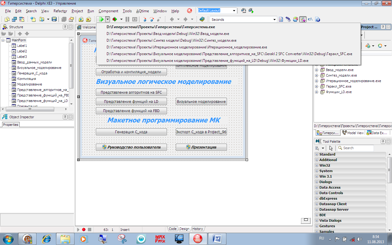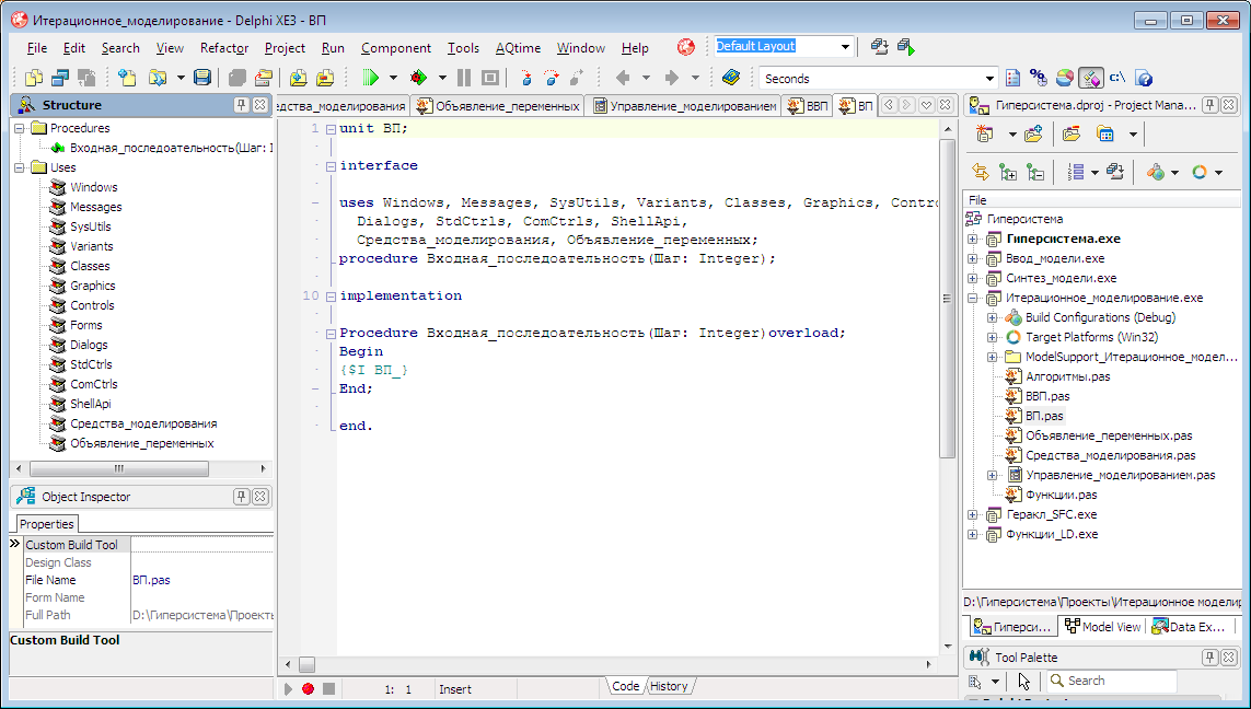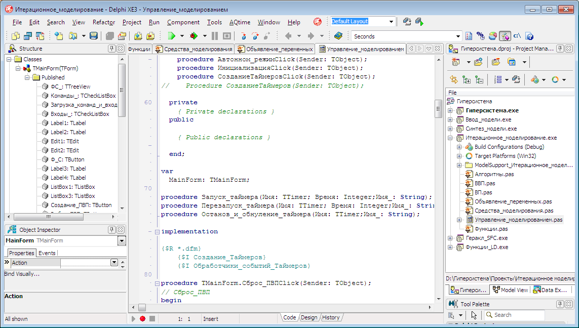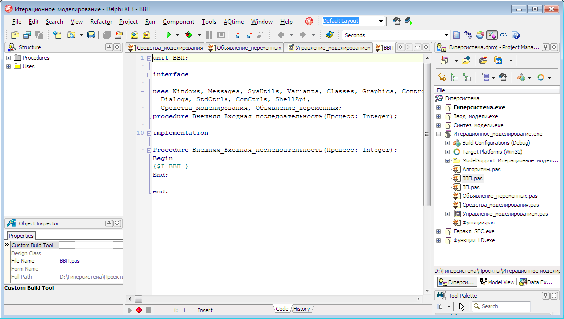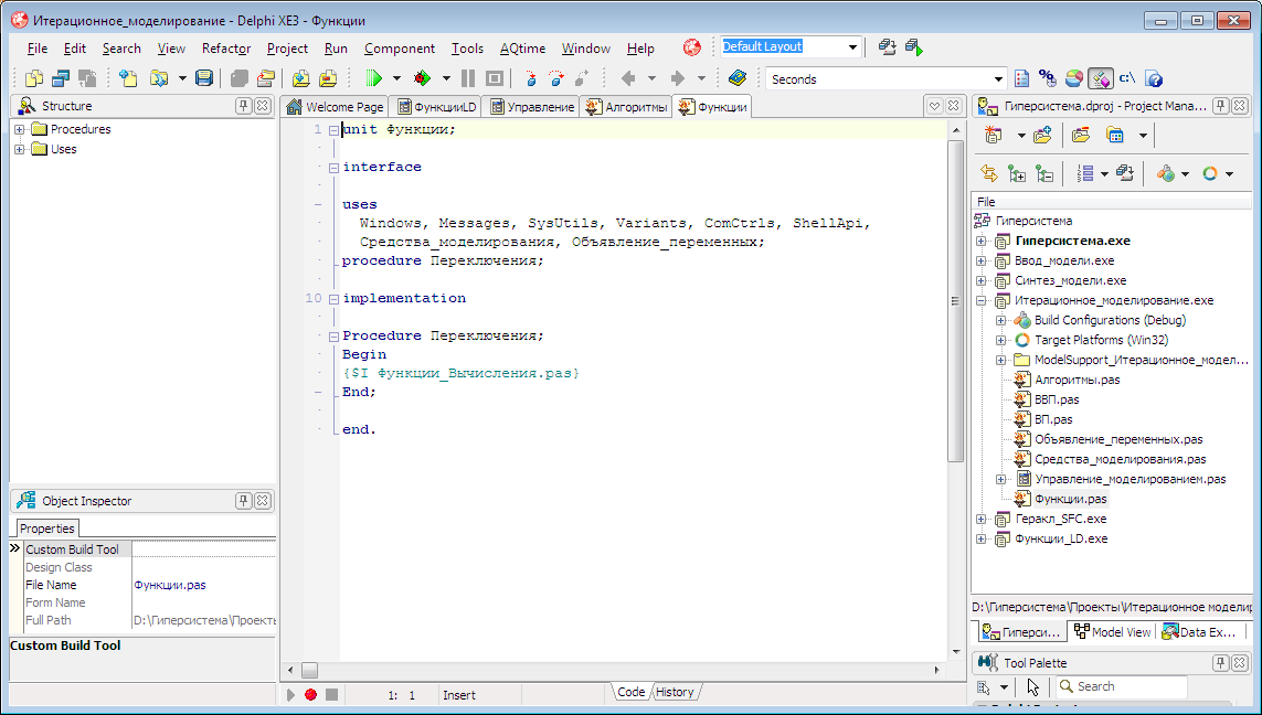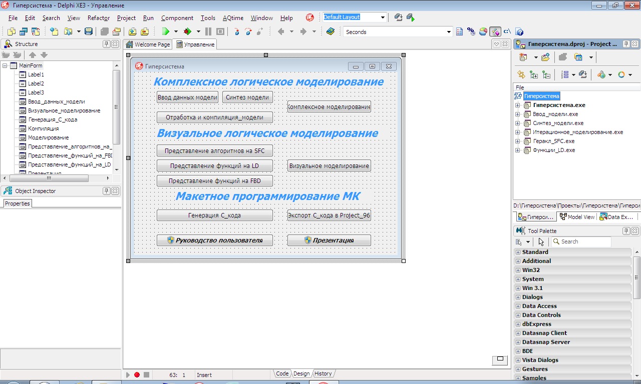 Композиционная модель УУ представляет собой композицию из предметных конструкций (логических данных ТЗ), программных конструкций (фрагментов кода DELPHI) и резидентных конструкций (шаблонов программ DELPHI приложения «Гиперсистема»). При этом предметные конструкции и программные конструкции составляют более 90% композиционной модели. Резидентные конструкции-шаблоны приложения «Гиперсистема» содержат директивы INCUDE, с помощью которых эти константные конструкции-шаблоны соединяются с переменными программными конструкциями, сгенерированными в процессе синтеза модели нового УУ, и образуют программную исполняемую модель управляющего устройства. Это очень важная концептуальная основа приложения «Гиперсистема» и ее нужно отчетливо представлять пользователю на этапе отработки (отладки) модели УУ. При выполнении команды Отработка и компиляция модели запускается среда разработки Delphi XE3.