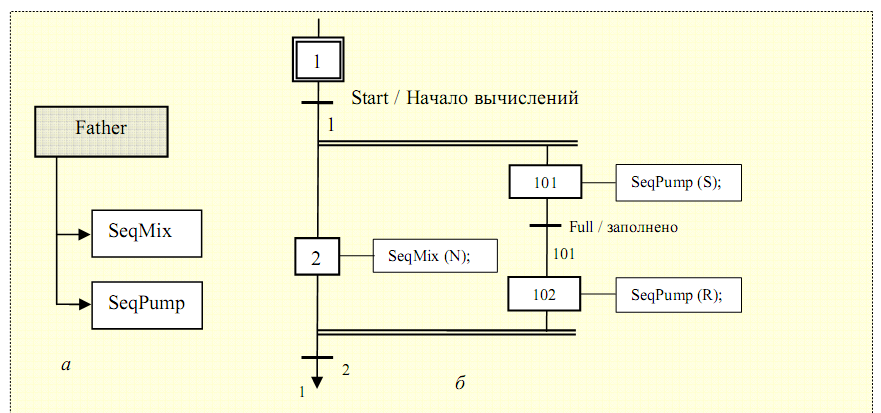 Иерархия программы SFC. Каждая SFC-программа может управлять (запускать, уничтожать, и т.д.) другими программами на этом же языке (SFC), которые в таком случае называют дочерними программами (наследниками) той программы, которая ими управляет. SFC-программы объединяются в иерархическое дерево на основе “родственных” отношений (родитель-наследник).