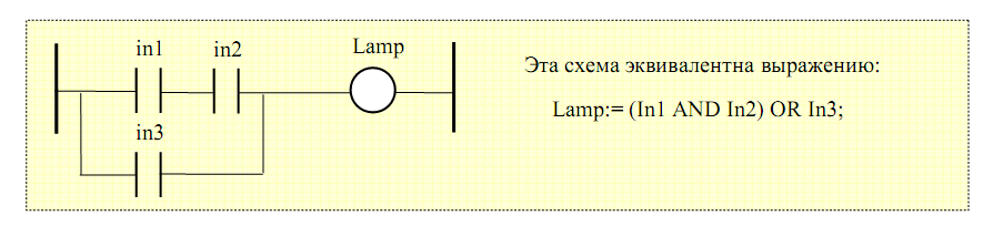 Язык LD – это графический язык - применяется для описания логических выражений различного уровня сложности, графического представления булевых уравнений. Он содержит контакты (входные аргументы) и катушки (выходные переменные). Элементы организуются в сеть релейно-контактных схем. При необходимости можно реализовывать более сложную логику, используя, например элементы языка FBD. Каждому контакту ставится в соответствие логическая переменная, определяющая его состояние. Ее имя ставится над контактом и служит его названием. Если контакт замкнут, то переменная имеет значение true, если разомкнут – false. Последовательное соединение контактов или цепей соответствует логической операции И/AND, параллельное – ИЛИ/OR. Нормально замкнутый (инверсный) контакт равнозначен логической операции НЕ. Релейная схема представляет собой 2 вертикальные шины питания, между которыми расположены горизонтальные цепи из контактов и катушек реле. Графические символы языка LD соответствуют элементам электрических цепей и имеют те же названия и обозначения.