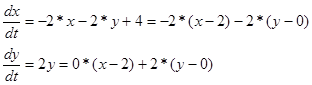 2. Для дослідження стійкості кожного з отриманих рішень, складаємо системи першого наближення в околицях точок рівноваги за допомогою розкладення в ряд Тейлора. Формула Тейлора для функції двох змінних x, y у першому наближенні (тільки рівень 1 похідних) для функції