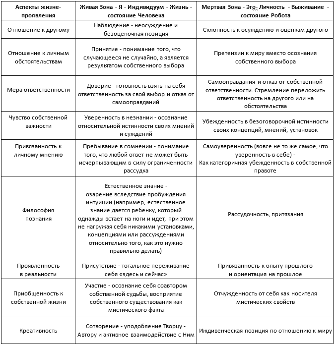 Возвращаясь к истокам личной эволюции, осознаем, что изначально выживание вовсе не подразумевает под собой никакого негативного контекста, а напротив, оно призвано гарантировать необходимое жизнеобеспечение особи, ее эффективное приспособление к среде, предоставить возможности для поступательного и продуктивного индивидуального развития. Тогда можно говорить о смысле и цели выживания. Смысл и цель выживания особи заключаются в ее переходе от выживания к жизни. Если цель достигается, то таким образом постигается и смысл (вот он где раскрывается, этот пресловутый смысл жизни) и обретается самодостаточная целостность. Возможности для полной самореализации открыты. «Эго» уступает свои позиции «Я», личность становится индивидуумом, творческие потенции максимально актуализируются. Тогда можно говорить о полноценной жизни, свободе и переживании счастья. Если же цели достичь не удается, мы созерцаем картину прямо противоположную: непостигнутый смысл, обрастая заурядной рутиной, становится банальной бессмыслицей. Вместо целостной индивидуальности присутствует расколотое, расщепленное, подчиненное обстоятельствам существо с подавленным, глубоко запрятанным, потерянным и растерянным Я, вместо которого диктаторствует психофизический робот, называемый Эго. В первом случае имеем Человека Разумного, во втором – человекообразного робота. Человек живет, робот озабочен выживанием. Все мы рождаемся роботами, но при этом каждый имеет шанс стать человеком. Кто‑то им становится, кто‑то нет. Разница между выживанием и жизнью в явном воплощении проявляется в тех признаках, которые отличают человека и робота. Механизмы выживания особи. При исследовании механизма выживания особи следует иметь в виду два его рабочих состояния. Одно естественное, нормальное, когда он исполняет присущую ему служебную функцию бесперебойного жизнеобеспечения. Второе – извращенное, при котором происходит нарушение изначально заданных функций. С психодинамической позиции подобным механизмом является ум. Теперь определимся в понятиях. Ум – это виртуальная алгоритмическая машина, которая определенным образом организует информацию в опыт. Ум – это пишущая машина. Ум записывает события, сортирует их, делает выводы, доказывает, составляет сценарии. Нормальная работа механизма «Ум – Особь»: • цель ума и его базовая функция – обеспечение выживания особи; • адаптация особи к миру начинается с ее идентификации с кем‑либо или чем‑либо, иными словами, только посредством подражания, отождествления особь способна развиваться и приспосабливаться к окружающей среде (см. Закон подражания); • следовательно, целью ума является выживание особи и того, чем или кем особь себя считает, с чем или с кем себя отождествляет; • ум работает для выживания того, с чем себя особь отождествляет, как будто это необходимо для самой особи. Извращенная работа механизма «Ум – Эго»: • извращение начинается тогда, когда особь отождествляет себя с умом. Такое состояние есть Эго; • когда особь начинает отождествлять себя с умом, а целью ума является выживание особи, то получается, что целью ума становится собственное выживание. И тогда он становится индифферентен к интересам и запросам особи; • ум постоянно ищет подтверждения того, что он жив и ничто не угрожает его выживанию; • 