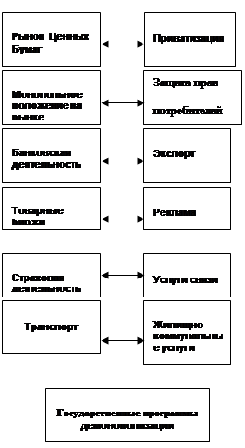 Высокий уровень монополизации и его резко отрицательное влияние на экономику делает необходимым проведение в нашей стране антимонопольной политики. Более того, Россия нуждается в демонополизации, т.е. радикальном сокращении числа секторов экономики, где установилась монополия. Главной проблемой и одновременно трудностью при этом является специфика унаследованного от социалистической эпохи монополизма: российские монополисты по большей части не могут быть демонополизированы путем разукрупнения. На Западе демонополизация предприятий-гигантов возможна путем их разделения на части. Тамошние монополисты формировались путем объединения и поглощения независимых фирм. Последние, хотя бы теоретически, могут быть восстановлены в качестве самостоятельных компаний. Российские монополисты, напротив, сразу строились как единый завод или технологический комплекс, который принципиально не может быть разделен на отдельные части без полного разрушения. Можно выделить три принципиальных возможности понижения степени монополизации: 1) прямое разделение монопольных структур; 2) иностранная конкуренция; 3) создание новых предприятий. Как уже сказано, возможности первого пути в российской реальности сильно ограничены. Единый завод на части не разделишь, а случаи когда производитель-монополист состоит из нескольких заводов одного профиля, почти не встречаются. Тем не менее, на уровне надфирменных структур – бывших министерств, главков, а также областных властей – такая работа отчасти уже сделана, а отчасти может быть продолжена, принеся пользу в деле понижения степени монополизации. Дело в том, что еще одна специфическая российская разновидность монополизма состоит в диктате ведомств и госорганов, продолжающих и в наше время активно вмешиваться в деятельность предприятий. Формально-юридических прав на это они не имеют – предприятия находятся в частной собственности. Но реальные рычаги давления органов власти есть. Например, не допустить в отрасль стороннего производителя с помощью частокола инструкций и распоряжений они вполне могут. Второй путь – иностранная конкуренция – явился, вероятно, самым действенным и эффективным ударом по отечественному монополизму. Когда рядом с изделием монополиста на рынке находится превосходящий его по качеству и сопоставимый по цене импортный аналог, все монополистические злоупотребления становятся невозможными. Монополисту приходится думать о том, как бы вообще не оказаться вытесненным с рынка. Беда в том, что из-за непродуманной валютной и таможенной политики, импортная конкуренция в очень многих случаях оказалась избыточно сильной. Вместо того чтобы ограничить злоупотребления она фактически уничтожила целые отрасли промышленности. Очевидно, что использование столь сильнодействующего средства должно быть очень осторожно. Импортные товары, бесспорно, должны присутствовать на российском рынке, являясь реальной угрозой для наших монополистов, но не должны превращаться в причину массовой ликвидации отечественных предприятий. Третий путь – создание новых предприятий, конкурирующих с монополистами, - предпочтителен во всех отношениях. Он устраняет монополию, не уничтожая при этом самого монополиста как предприятие. К тому же новые предприятия – это всегда рост производства и