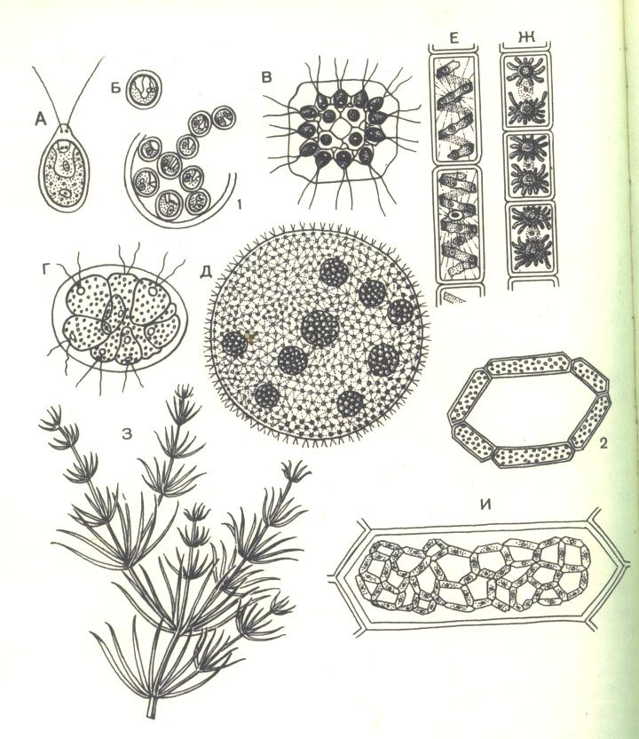 НИЗШИЕ РАСТЕНИЯ Наиболее древняя и сравнительно просто устроенная группа водных растений – это водоросли. Водоросли относятся к низшим растениям, их вегетативное тело не расчленено на корень, стебель и листья. Это типичные автотрофные организмы: благодаря наличию хлорофилла они способны усваивать на свету углекислый газ и синтезировать органические вещества из неорганических. В зависимости от экологических условий водоросли в водоеме образуют отдельные группировки, или ценозы. Различают планктонные водоросли (фитопланктон), населяющие толщу воды. Это микроскопические формы, пассивно взвешенные в воде и неспособные противостоять течениям. Приспособлениями к обитанию к воде, кроме малых размеров, служат жгутики, запасной продукт в виде капель жира в клетках, газовые вакуоли. Планктонные водоросли вызывают «цветение» воды в мелких, хорошо прогреваемых солнцем водоемах. Рис.11 Водоросли А – хламидомонада; Б- хлорелла; В – гониум; Г – пандорина; Д – вольвокс; Е – спирогира; Ж – зигнема; З – хара; И – водяная сеточка (внутри материнской клетки). Фитопланктон водоема может состоять из зеленых, сине-зеленых, диатомовых водорослей. Пруды, канавы и ямы характеризуются массовым развитием зеленых нитчатых водорослей из класса сцеплянок (спирогира, зигнема и др.). В поле зрения микроскопа клетки этих водорослей изумительно красивы, так как хроматофоры в них имеют правильную геометрическую форму и яркий зеленый цвет. У лишенных активного движения форм увеличение плавучести достигается соответствующей формой тела и наличием разнообразных отростков. Это может быть плоская форма тела, или лентообразные колонии, или длинные шипы. У колониальных форм клетки могут слагаться в форме парашюта. Газовые вакуоли, капли жира также значительно уменьшают вес клеток водорослей из группы планктонных. Изучать планктонные водоросли нужно при помощи сильной лупы или микроскопа. «Цветение» воды – временное явление в жизни водоема. Основное значение имеет температура воды, и главным приспособлением к ее переменам у большинства планктонных водорослей являются специальные покоящиеся клетки. Эти клетки покрываются толстой оболочкой и располагают большим запасом питательных веществ. Бентосные водоросли (фитобентос) связаны с дном водоема. Они прикрепляются к камням или другим твердым предметам на дне, стеблям высших растений. Часто на дне образуют густые заросли крупные харовые водоросли, жесткая на ощупь кладофора. Некоторые водоросли (например, спирогира) свободно лежит на дне водоема ночью, а днем, увлекаемые пузырьками кислорода, выделяющегося на свету при фотосинтезе в клетках водорослей, большими массами поднимаются на поверхность водоема - это так называемая тина. Свет – могущественный фактор в распределении бентосных водорослей. В озерах с прозрачной водой (например, в озере Байкал) бентосные водоросли могут находиться на глубине до 70 м. РАСТЕНИЯ НА БЕРЕГАХ ВОДОЕМА