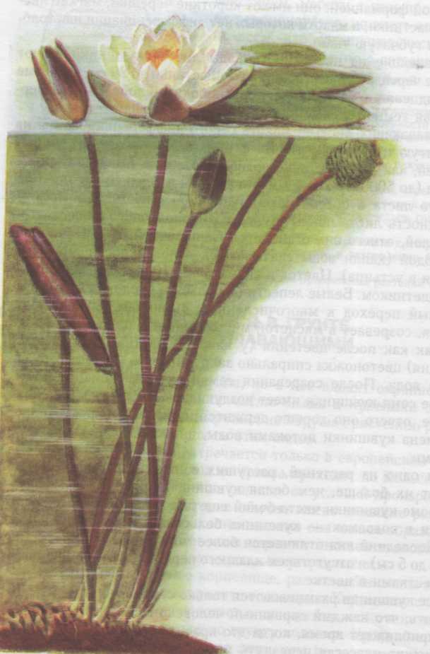 РАСТЕНИЯ, УКОРЕНЯЮЩИЕСЯ В ГРУНТЕ ВОДОЕМА, С ЛИСТЬЯМИ, ПЛАВАЮЩИМИ НА ПОВЕРХНОСТИ ВОДЫ Это немногочисленная группа, но в нее входят охраняемые водные растения – кувшинка чисто-белая и кубышка желтая, поэтому нужно очень подробно, не нарушая растения, разобрать на экскурсии особенности этих видов. Кувшинка чисто-белая встречается только в европейской части России. Размеры растения зависят от условий произрастания: в мелких водоемах кувшинка имеет меньшие размеры. При периодическом высыхании водоема она может образовывать сухопутную форму. При этом черешки листьев становятся толще, клетки кожицы на листьях также утолщаются. Кувшинка имеет мощное корневище, расположенное на дне, от которого отходят толстые, придаточные корни. Корневище слабо ветвится, но постепенно нарастает в длину, так что очень медленно растение перемещается по грунту водоема. Уровень водоема может изменяться в течение лета, тем не менее, листья и цветки кувшинки остаются на поверхности воды, что достигается либо изгибанием черешков и цветоножки, либо их усиленным ростом. Как и многим водным растениям, кувшинке свойственна разнолистность (гетерофиллия). Весной первые листья образуются подводной формацией: они имеют короткие черешки, мягкие листовые пластинки, в мякоти которых нет дифференциации на столбчатую и губчатую ткань. Плавающие на поверхности воды листья кувшинки имеют длинные черешки, диаметр листовой пластинки до 20 см, по форме она сердцевидно-овальная с неравнобокими лопастями. Сверху листья темно-зеленые, снизу – красновато-фиолетовые. У плавающих листьев мякоть строго дифференцирована на столбчатую и губчатую ткань. В них так же много воздушных полостей, как и в пластинке подводного листа. Многочисленные устьица (до 500 штук на мм2) находятся в верхней кожице плавающего листа и обеспечивают газообмен с воздушной средой. Поверхность листа покрыта слоем жироподобного вещества – кутикулой, отчего она становится глянцевитой, плохо смачивается водой (капли воды скатываются с поверхности листа, не попадая в устьица).