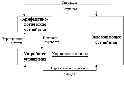 Для улучшения понимания вопросов взаимодействия узлов и устройств ЭВМ рассмотрим автоматическое выполнение команды в трехадресной ЭВМ с классической архитектурой. Структурная схема такой ЭВМ показана на рисунке 6.