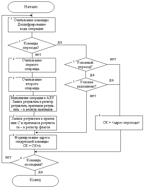 Рисунок 6 -Структурная схема трехадресной ЭВМ Обработку команды можно разбить на ряд функционально завершенных действий (этапов), составляющих ее цикл (рисунок 7). Изучение цикла команды проведем при следующих начальных условиях и предположениях: программа и операнды находятся в оперативном запоминающем устройстве (ОЗУ); адрес ячейки ОЗУ, в которой находится выполняемая команда (k), зафиксирован на счетчике команд (СК); команда считывается за одно обращение к ОЗУ; команда, операнды и приемник результата используют прямую адресацию памяти.