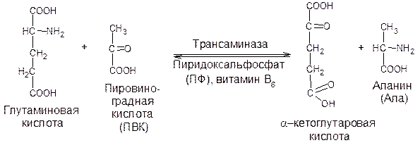 В реакции трансаминирования донором аминогрупп служит в основном глутаминовая кислота, их акцептором – a-кетокислоты – промежуточные продукты катаболизма моносахаридов; при этом образуются a-кетоглутаровая кислота и соответствующая аминокислота. Эта реакция катализируется пиридоксальзависимым ферментом – трансаминазой: