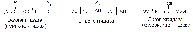Белки, поступившие в организм с пищей, в желудочно-кишечном тракте расщепляются до аминокислот при действии группы протеолитических ферментов – пептидгидролаз (по современной номенклатуре); широко известно их тривиальное название – протеазы, или протеиназы. Эти ферменты катализируют гидролитическое расщепление пептидной связи в белках. Протеолитические ферменты животных и человека изучены достаточно хорошо, в меньшей степени исследованы растительные протеазы. Для протеолитических ферментов характерен ряд общих свойств и особенностей. Ферменты, расщепляющие белки, обладают относительной субстратной специфичностью, которая определяется: – длиной полипептидной цепи; – структурой радикалов аминокислотных остатков, образующих гидролизуемую пептидную связь; – положением связи в полипептиде. Внутренние пептидные связи расщепляются эндопептидазами, концевые – экзопептидазы:
