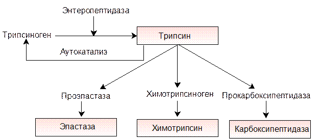 В результате действия пепсина белки в желудке распадаются на полипептиды; свободные аминокислоты при этом практически не образуются. Пепсин наиболее активно гидролизует пептидные связи, NH2- группа которых принадлежит ароматическим аминокислотам – тирозину, фенилаланину, триптофану. Дальнейшее превращение высокомолекулярных пептидов и белков, не расщепленных пепсином, происходит тремя эндопептидазами, вырабатываемыми поджелудочной железой в виде предшественников – трипсиногена, химотрипсиногена и проэластазы. Активация трипсиногена происходит при участии фермента энтеропептидазы, выделяемого клетками кишечника. Энтеропептидаза отщепляет N-концевой гексапептид трипсиногена, в результате чего происходит изменение конформации оставшейся части молекулы и формируется активный центр – получается фермент трипсин. Основное количество трипсиногена активируется трипсином путем аутокатализа. Трипсин обладает сравнительно узкой субстратной специфичностью, разрывая пептидные связи, в образовании которых участвуют карбоксильные группы лизина и аргинина, т.е. основных аминокислот. В поджелудочной железе синтезируется ряд химотрипсинов (a-, b-, p– химотрипсины) из двух предшественников – химотрипсиногена А и химотрипсиногена В. Активируются зимогены в кишечнике под действием активного трипсина и химотрипсина.