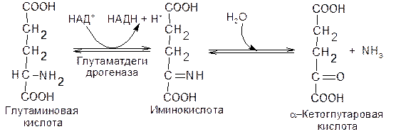 Для животных тканей, растений и большинства аэробных микроорганизмов преобладающим является окислительное дезаминирование. Окислительное дезаминирование аминокислот протекает в две стадии. Сначала аминокислота окисляется в иминокислоту при участии специфической дегидрогиназы с НАД+ или НАДФ+ в качестве кофермента и акцептора водорода. Затем иминокислота спонтанно гидролизуется на кетокислоту и аммиак: