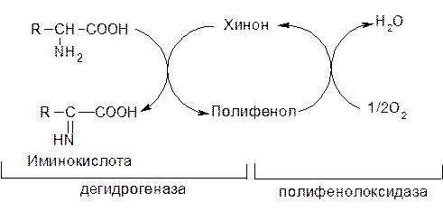 В некоторых случаях дегидрогиназы аминокислот представлены флавопротеинами, т.е. содержат в качестве кофактора ФАД или ФМН. В растениях дезаминирование аминокислот может осуществляться при участии полифенолоксидазы по следующей схеме: